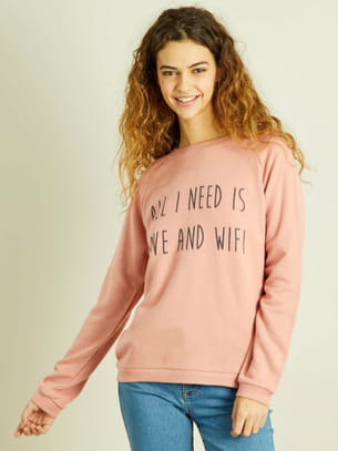 Pull à manches longues et col rond en molleton rose poudré avec inscription humoristique en noir de Kiabi