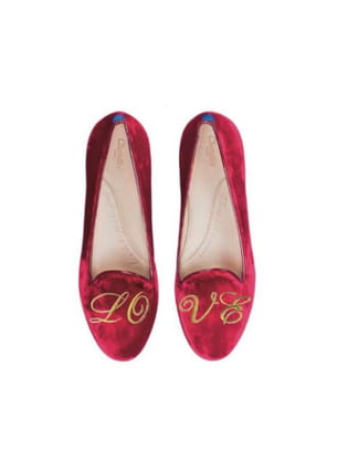 Chaussures en velours rouge à laquelle on peut ajouter une lettre brodée et des pampilles décoratives de Chatelles