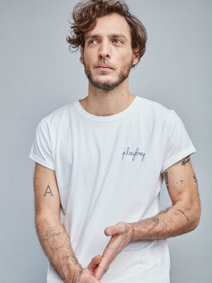 Tee shirt blanc en coton avec broderie "Playboy" sur le cœur de Maison Labiche