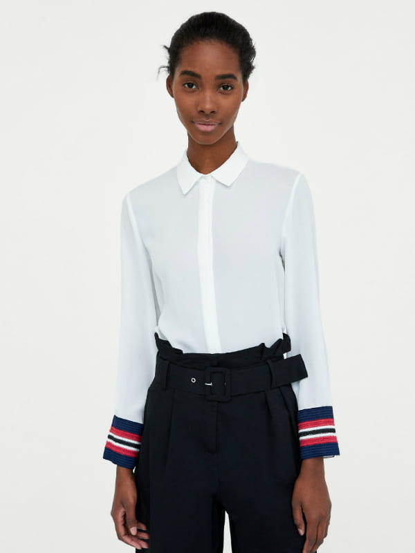 Chemise fluide en coton blanc cassé à manches longues aux poignets tricolores de Zara