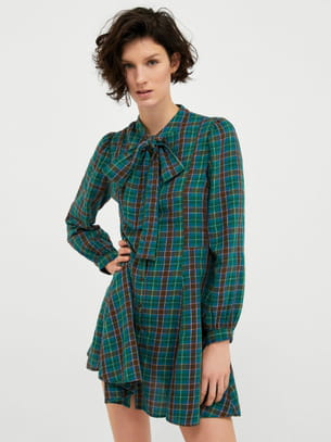 Robe courte à carreaux verts, col rond noué, manches longues et poignets boutonnés de Zara
