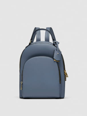 Sac à dos en simili cuir bleu-gris avec deux poches, fermeture zippée et breloque sur l'étiquette de Zara