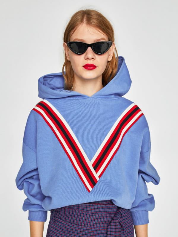 Sweat large bleu ciel à capuche et manches longues avec rayures en contraste rouges, noires et blanches de Zara