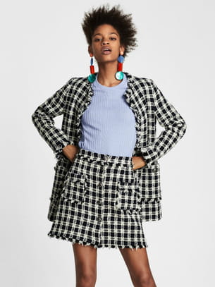 Jupe trapèze courte façon tweed noir et écru à carreaux de Zara