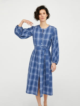 Robe midi bleue ceinturée sans col et entièrement boutonnée à manches longues et imprimé carreaux de Zara