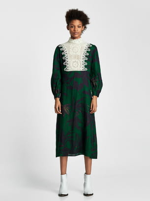 Robe midi à imprimé vert fleuri, col montant et plastron blanc de Zara