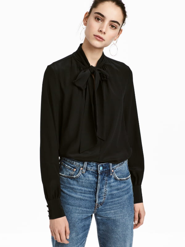 Chemisier ample en soie noire à manches longues larges et lavallière à nouer d'H&M