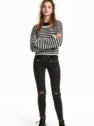 Pantalon ultra skinny en denim noir délavé à détails usés et coutures décoratives d'H&M