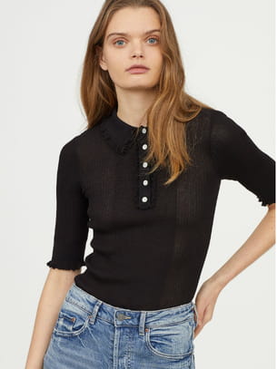 Haut vaporeux en maille côtelée noire à col, boutonnage et manches courtes volantés d'H&M