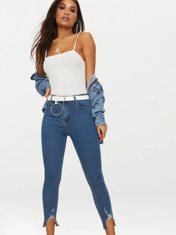 Pantalon skinny 7/8ème en denim à découpes en V au niveau de l'ourlet de Prettylittlething
