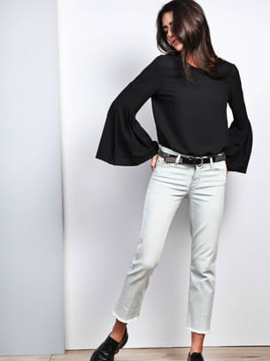 Pantalon slim 7/8ème en denim bleu ciel délavé à bords frangés de Les Petites