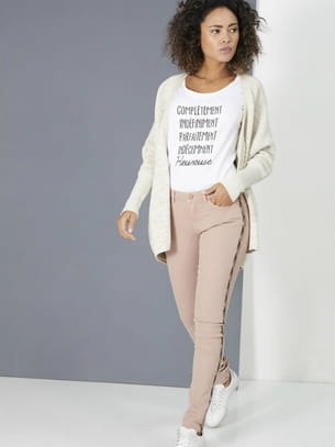 Pantalon slim en denim rose poudré à détails ethniques sur les côtés de I.code
