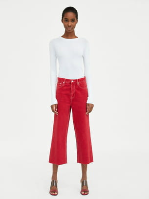 Pantalon taille haute en denim rouge à ourlet à franges de Zara