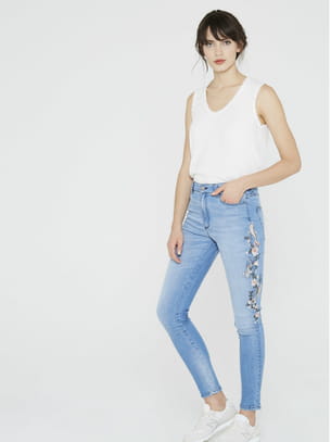 Pantalon skinny en denim clair à broderies fleuries japonisantes d'IKKS