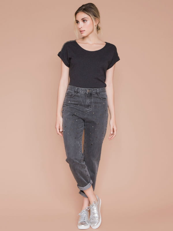 Pantalon slim 7/8ème en denim noir à clous décoratifs de Suncoo