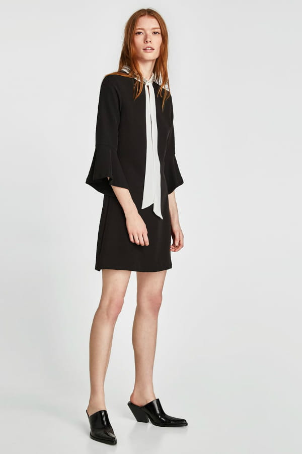Robe noire courte avec bijoux et lavallière blanches de Zara