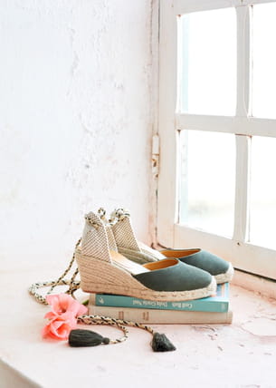 Espadrilles compensées bicolores écru et vert amande avec lien à pompons à nouer à la cheville de Sézane