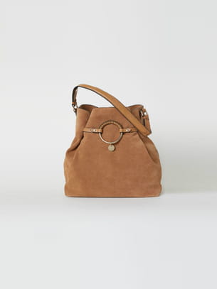 Sac seau camel en suède avec brides décoratives en cuir et anneau en métal avec pendentif sur le devant de H&M