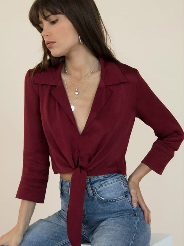 Blouse croped bordeaux décolletée et nouée sur le devant de Sisterhood sur ASOS Marketplace