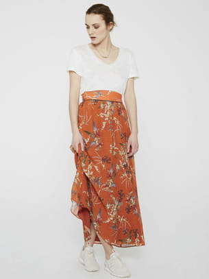 Jupe longue couleur mandarine à imprimé floral japonisant de IKKS