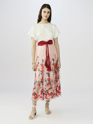 Jupe longue en tulle rose brodé de fleurs colorées de Maje