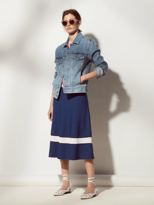 Jupe midi bleu avec bande blanche en maille de Sandro