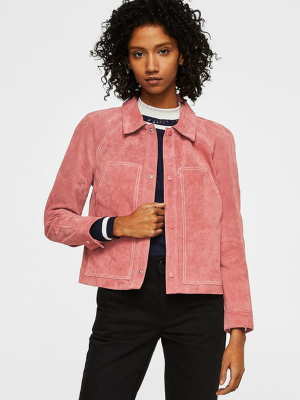 Blouson en cuir rose clair à surpiqûres de Mango