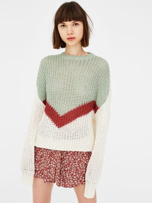 Pull motif color block vert rouge et crème en grosse maille de Pull and Bear