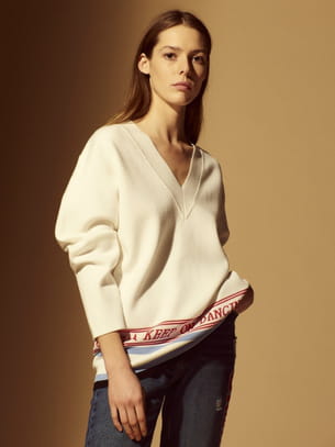 Pull blanc à col V avec inscription "Keep on dancing" vers le bas de Sandro