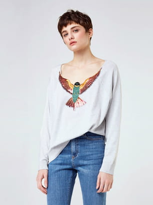 Pull fin gris à large encolure décoré avec un oiseau brodé de sequins de Uterqüe