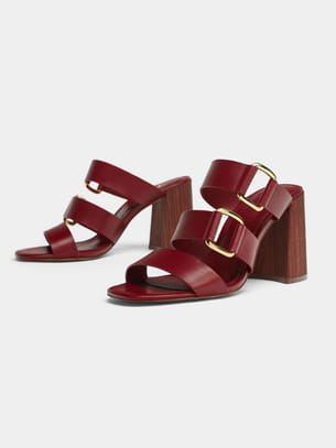 Mules sandales à talon en bois avec lanières bordeaux et boucles dorées de Uterqüe