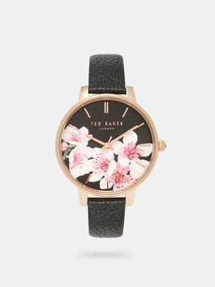 Montre à cadran fleuri avec bracelet noir en cuir de Ted Baker