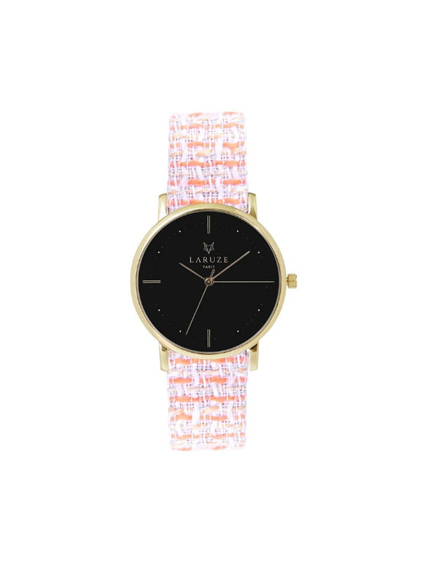 Montre à cadran noir avec bracelet en tissu beige orange et rose de Laruze