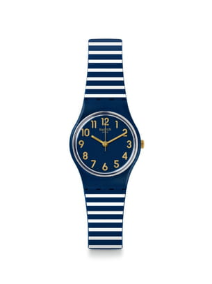 Montre en plastique bleu marine à rayures blanches de Swatch
