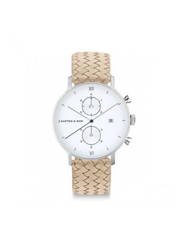 Montre à cadran blanc et boîtier en acier argenté avec bracelet beige en cuir italien tissé de Kapten & Son