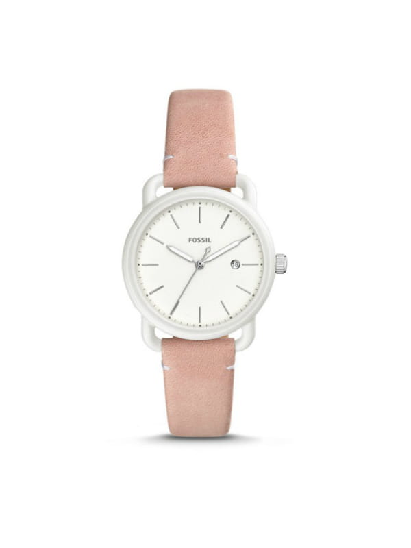 Montre à cadran blanc et boîtier en argent avec bracelet en cuir rose poudré de Fossil