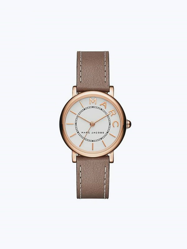 Montre à cadran blanc et boîtier rose gold avec bracelet en cuir de couleur taupe de Marc Jacobs