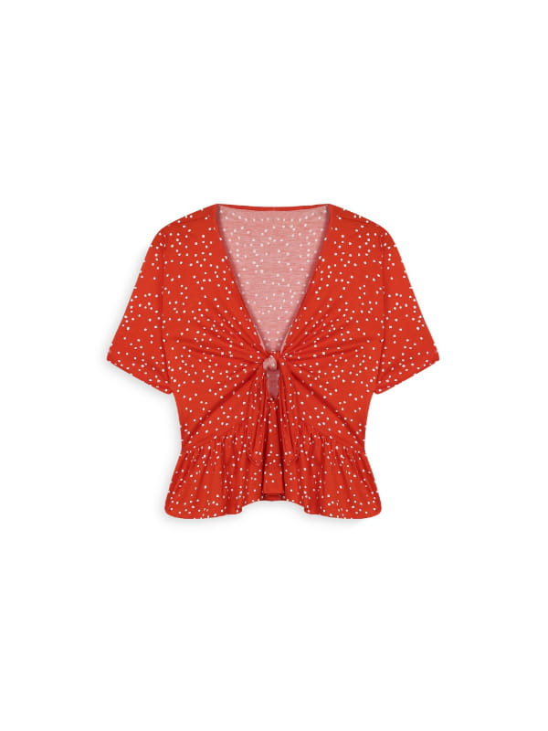 Top rouge effet cache-cœur noué sous la poitrine à pois blancs de Primark