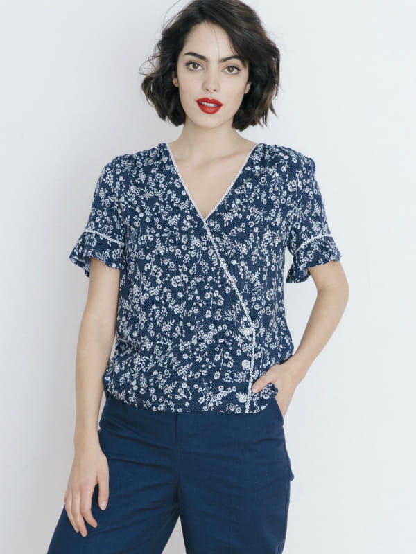 Blouse cache-cœur à boutons et dentelle bleue imprimée de Grace & Mila