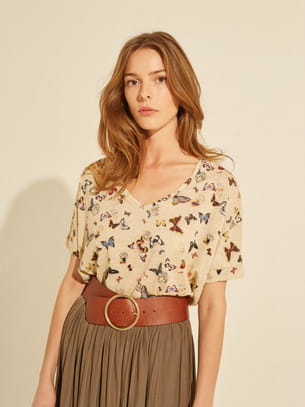 T-shirt beige en lin et coton à imprimé papillons de Gérard Darel