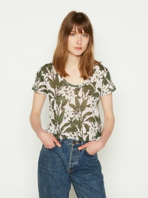 T-shirt en lin vert et blanc à imprimé floral de Monoprix