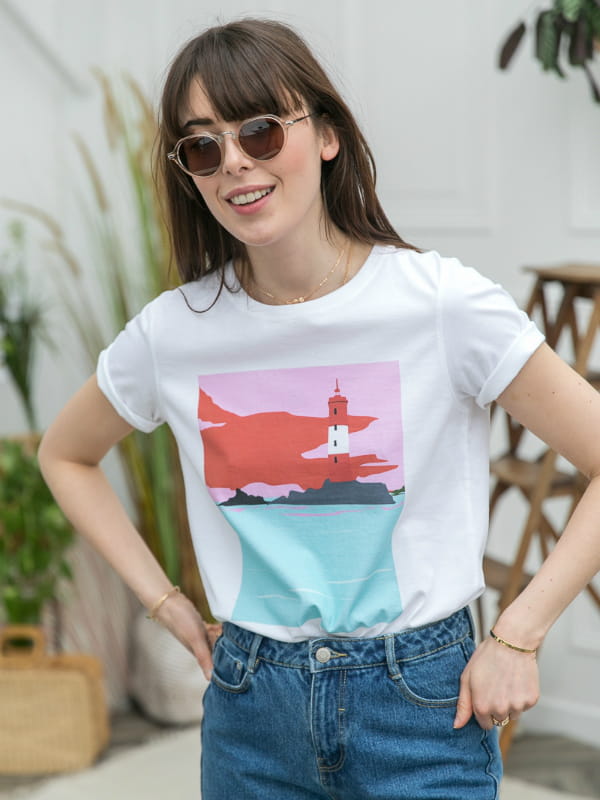 T-shirt blanc à col rond avec imprimé phare de Opullence
