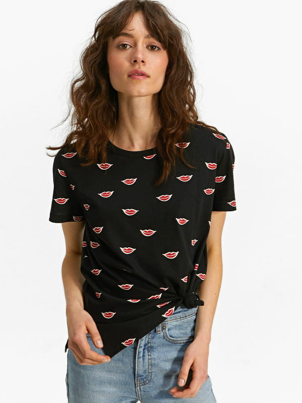 T-shirt noir col rond imprimé de bouches rouges de Stradivarius