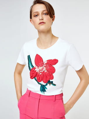 T-shirt blanc en coton avec une fleur brodée sur le devant de Uterqüe
