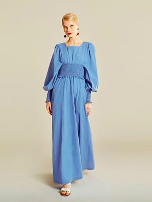 Maxi robe smockée en popeline bleue à encolure carrée, manches bouffantes et large ceinture de Jour Né