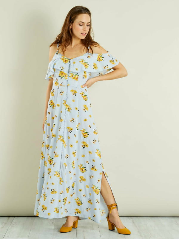 Maxi robe fleurie bleue clair aux épaules dénudées de Kiabi