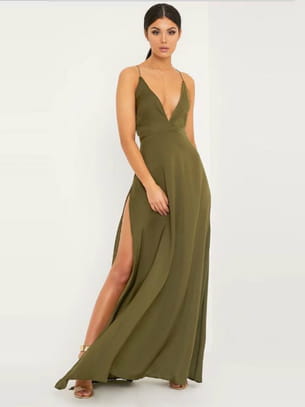 Maxi robe kaki à fines bretelles et décolleté plongeant de PrettyLittleThing