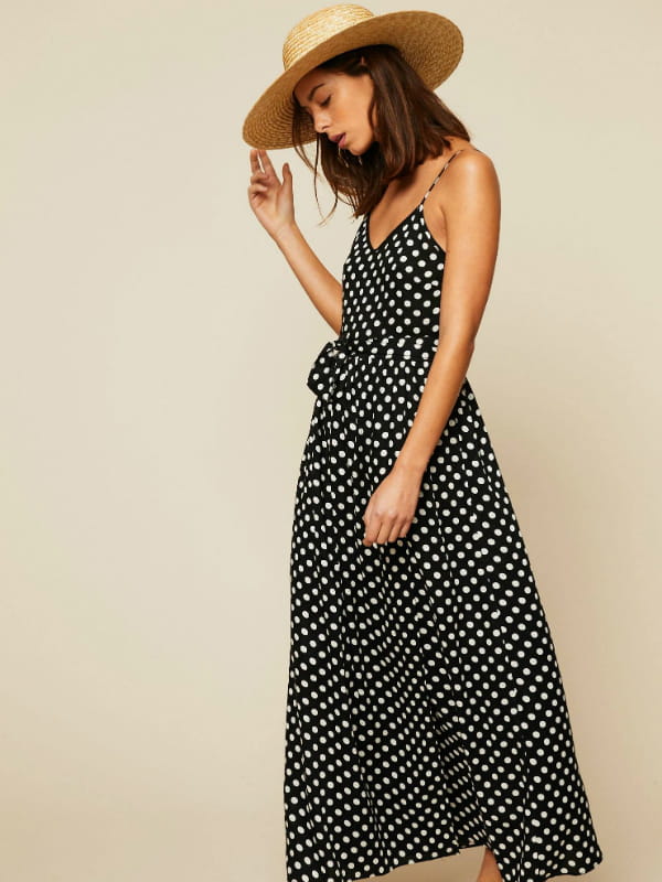 Maxi robe noire et blanche à pois nouée à la taille de Prism chez Mon Showroom