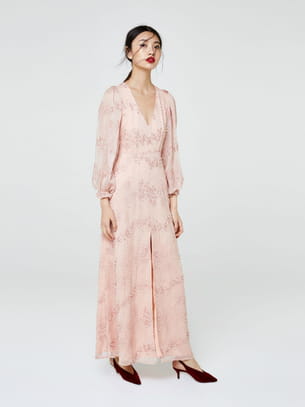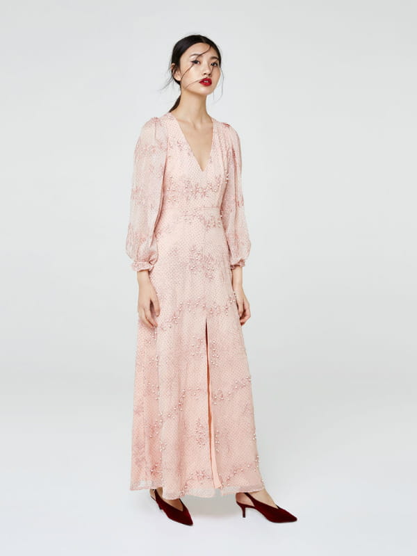 Maxi robe rose poudré à manches longues ornée de coraux brodés et de pierres fantaisie de Uterqüe