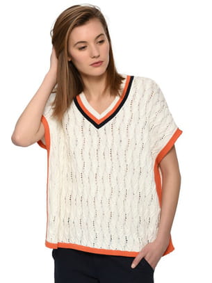 Pull poncho sans manche en coton torsadé écru avec col V rayé orange et noir de Roland Garros